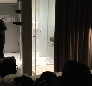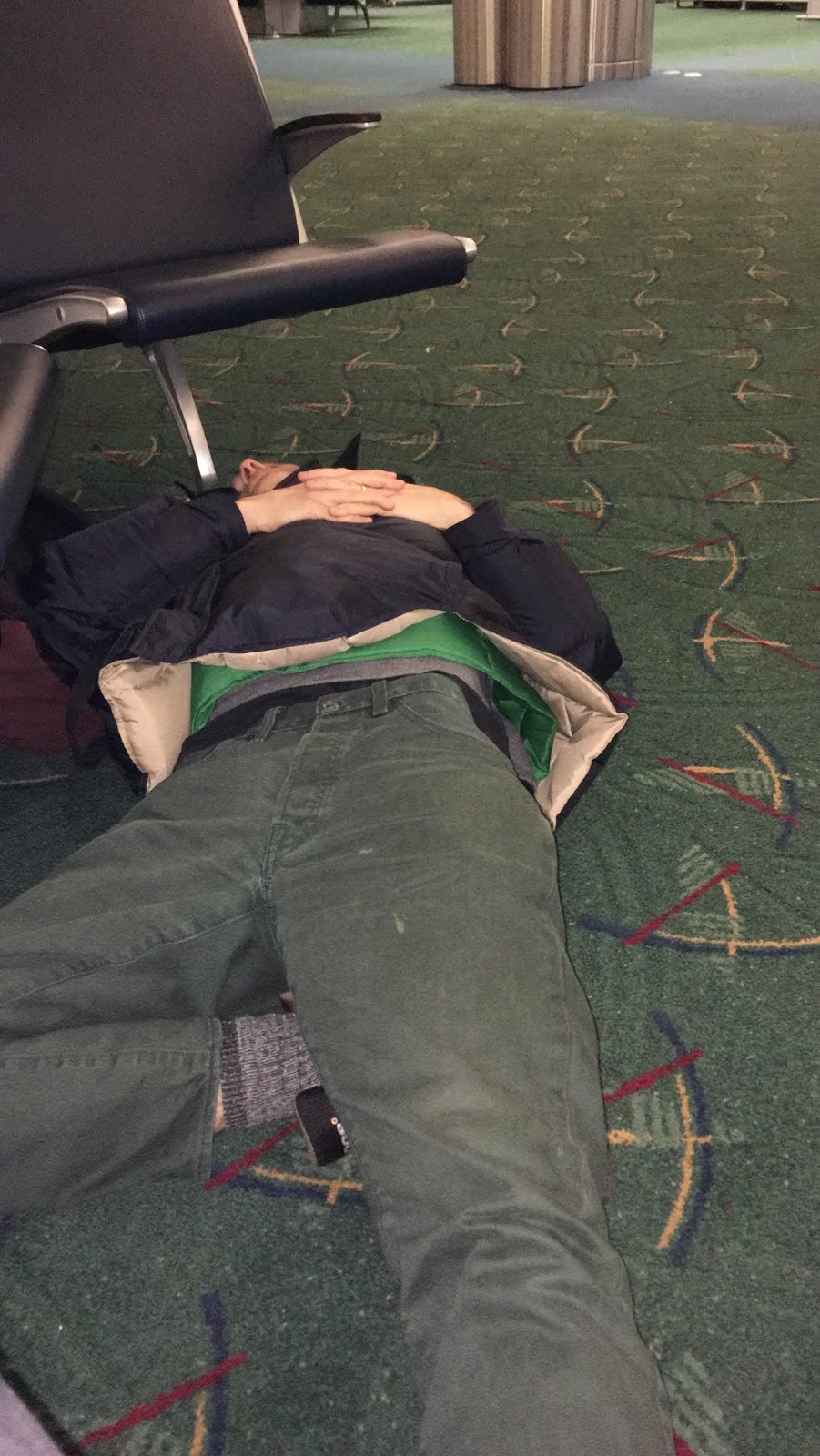 | Leaving Frankfurt, 11 hours to Seattle, 4 hour layover in Seattle, Sleeping on the new, famous PDX carpet. |