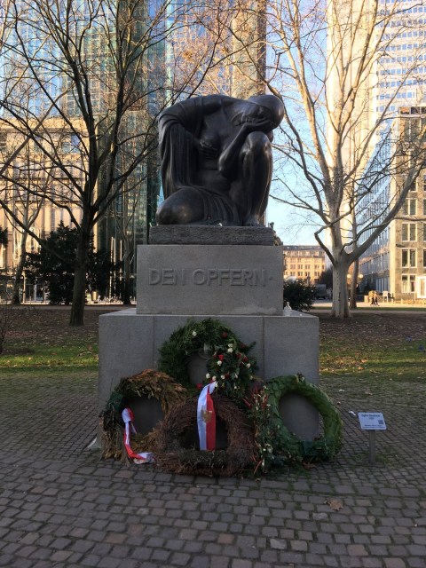 As with most German cities, the built environment is complex. Each building has convoluted history as does each sculpture. We wandered through a chilly city sculpture garden, finding Den Opfern (the victims) by Benno Elkan from 1920, memorializing World War I. It now does double duty also memorializing World War II as it was removed in 1933 by the Nazi\’s (Benno was Jewish), but was replaced in 1946.