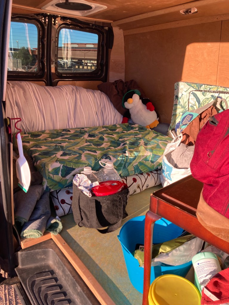 By the time we exited the park, fully striking out after visiting all the completely full “no reservation needed” campgrounds, all was dark, but on the horizon, the bright lights of Tortoise Rock casino. Those obnoxious flood lights, never looked so good. Using the iOverlander App, which details free overnight parking spots, as our guide (we apparently need one), Nick walked into the casino to get an overnight parking pass from security. Apparently he appeared a bit dazed, delirious, or maybe even drunk; more likely he was dazzled by the minor league casino since he was completely sober. The security team asked if he was all right and what was he driving. Not realizing that RVs were welcomed but car dwellers not, Nick minimized our amenities ( is a luggable loo an amenity?) so the security officer asked to see our rig. Nick, still seemingly disoriented, at first couldn’t find the van, and worried that Patricia would be using the loo when he opened the door for the officer. Fortunately, not the case. Officer McG loved the van, even gave us an unsolicited extra 24 hours to stay. But, as he left he made sure we understood no alcohol drinking in the parking lot.