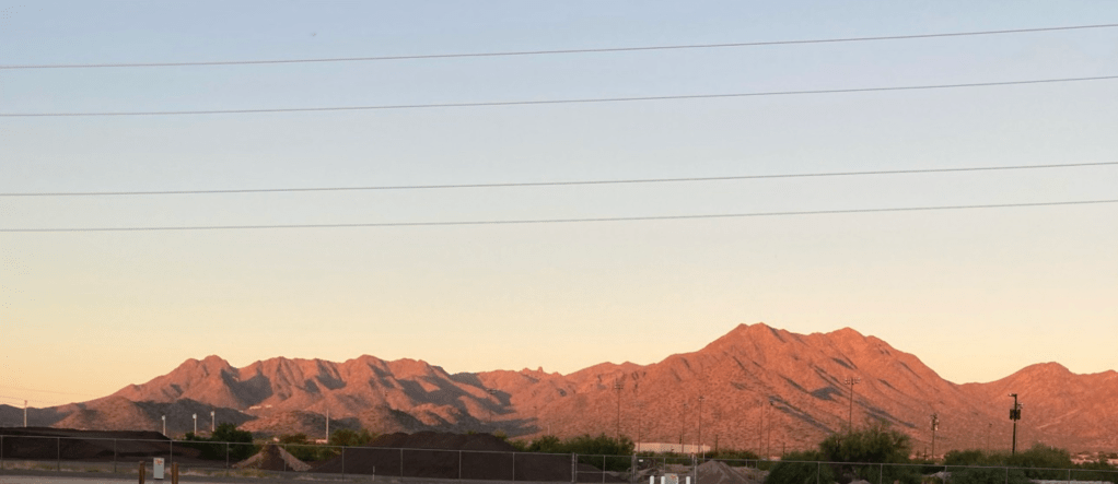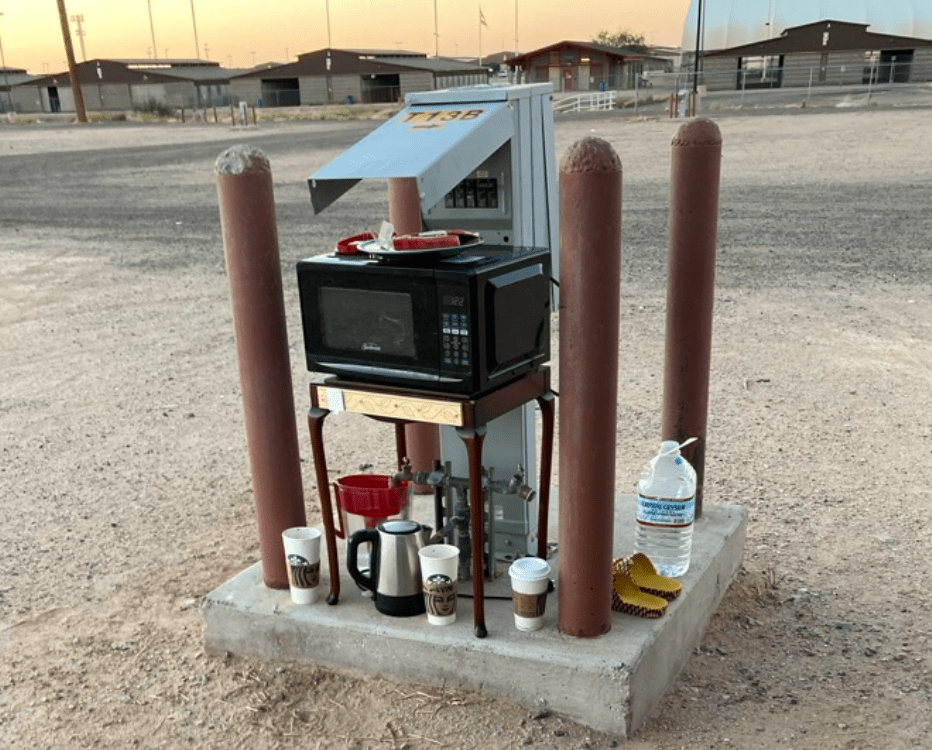 We turned off Frank Lloyd Wright Dr, past a giant horse sculpture, past a cyclone fence on to a huge dirt lot radiating Arizona heat. The RV lot was adjacent to an equestrian center, under three enormous major power lines that audibly hummed and crackled. The field was dotted with posts in a grid pattern, like speakers at a drive in theater with electric outlets and water for the camping spaces.